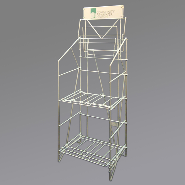 2 shelf, foldable, broadsheet rack with paper display holder, top sign and 32 1/2 inches of stacking capacity.