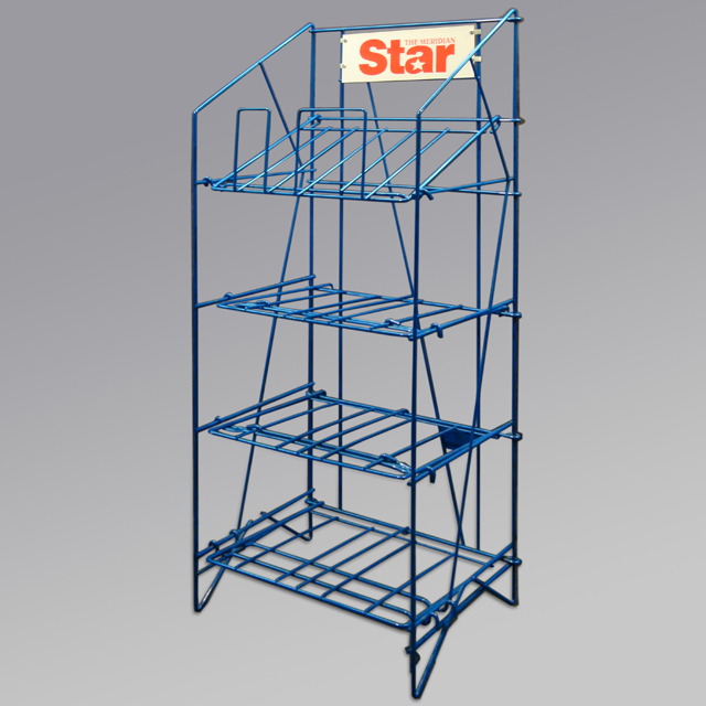 3 shelf, foldable, broadsheet rack with angled top shelf and 31 inches of stacking capacity.