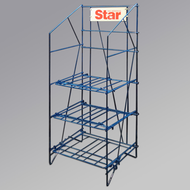 3 shelf, foldable, broadsheet rack with 32 inches of stacking capacity.